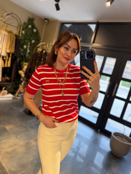 Misse Kırmızı / Beyaz Triko Dokulu T-Shirt