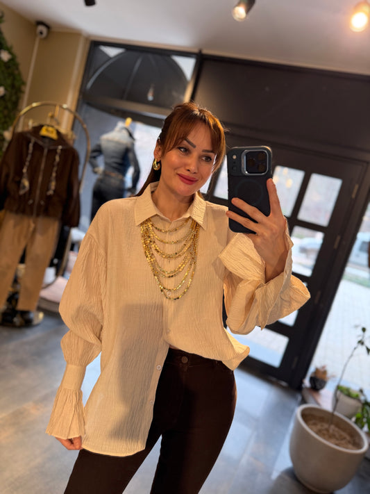 Reta Volanlı Bej Tiril Gömlek