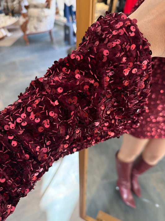 Nira İspanyol Kol Pullu Bordo Elbise