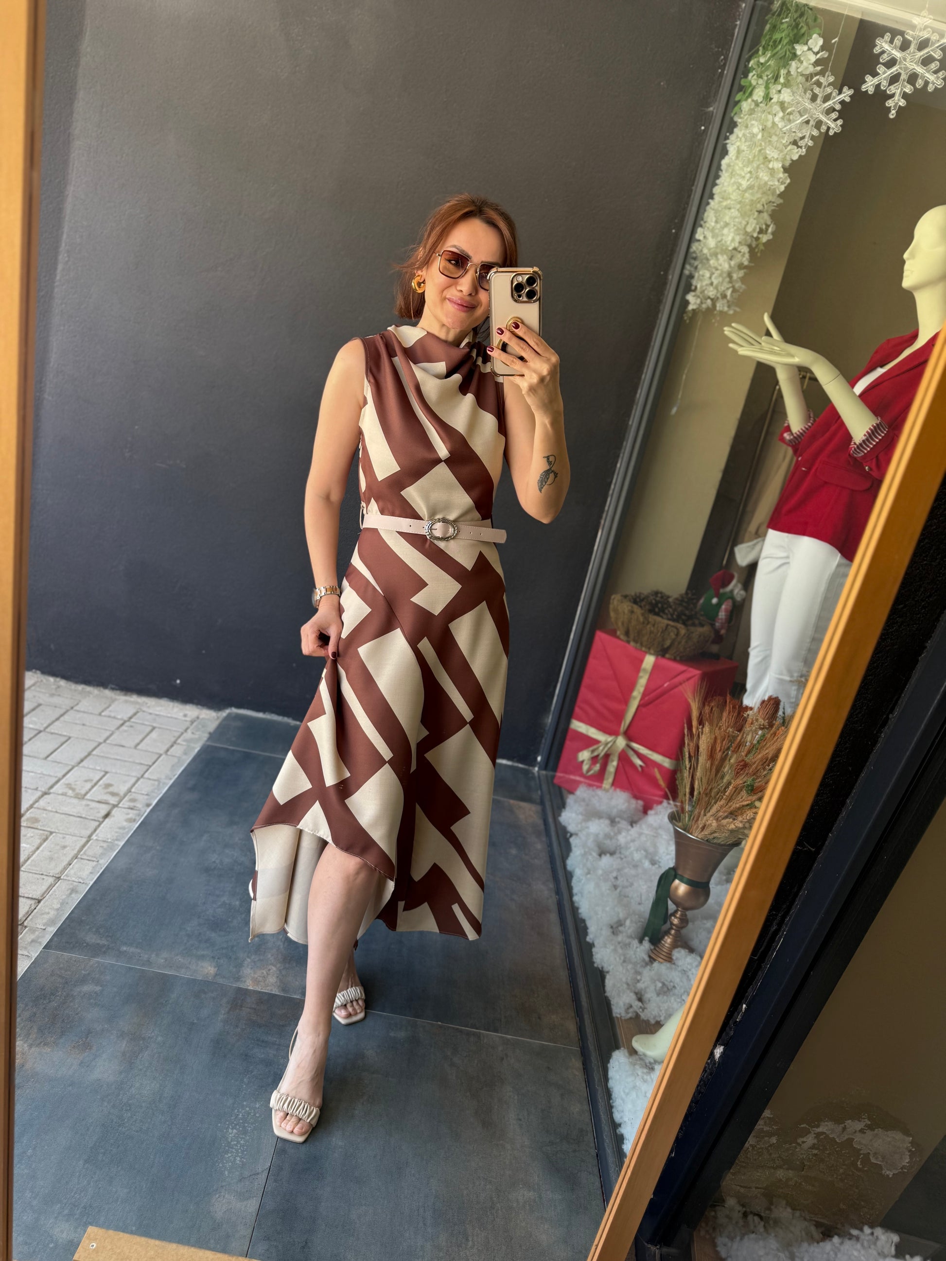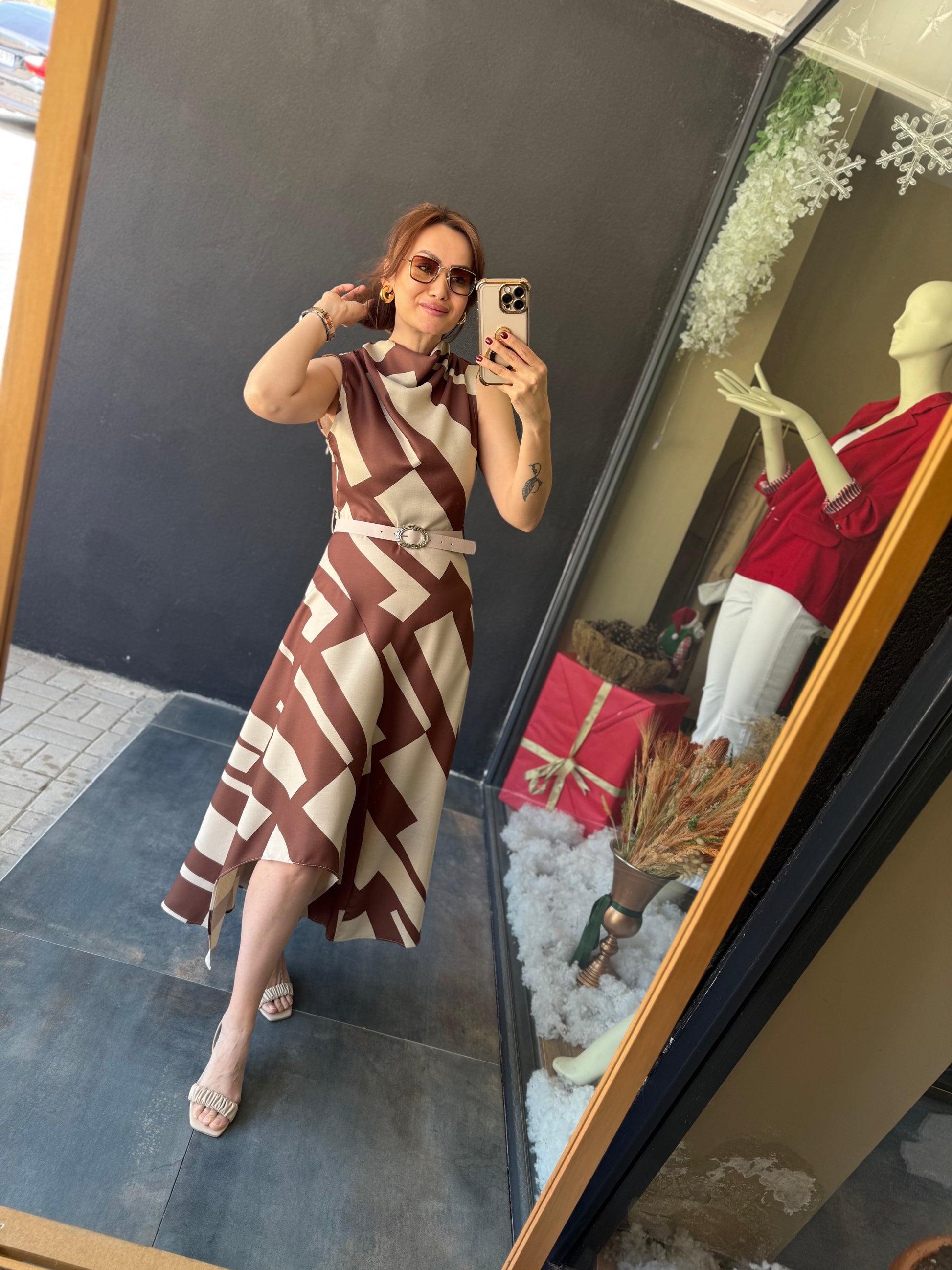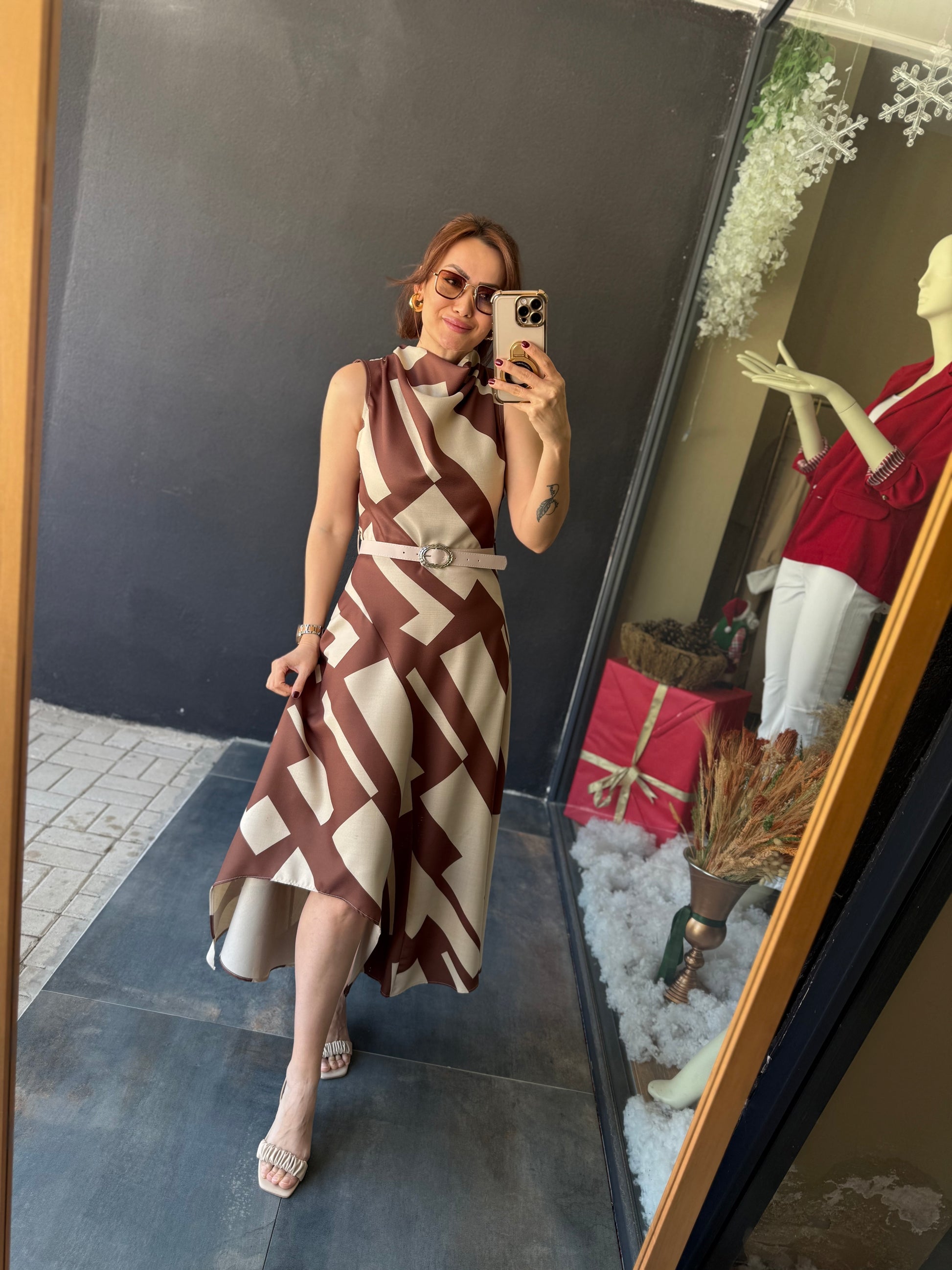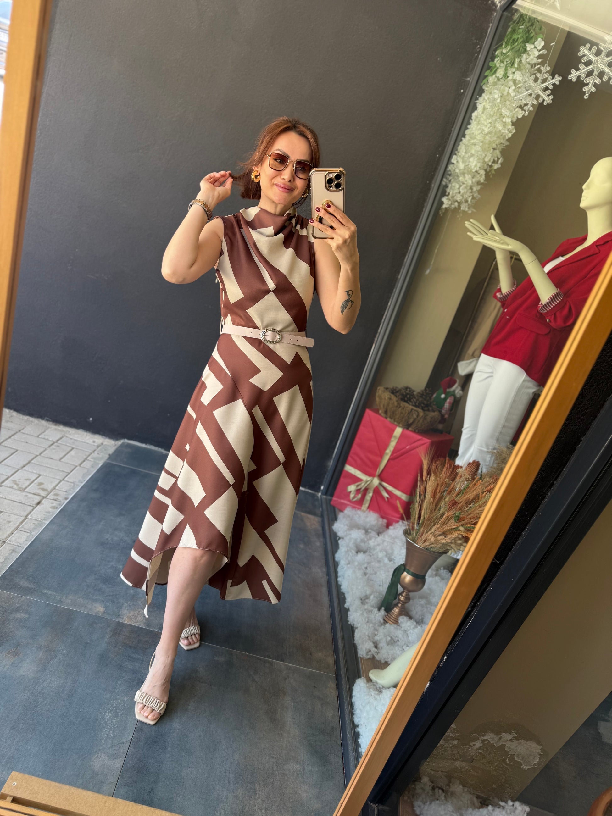 Alba Kahve Keten Midi Elbise