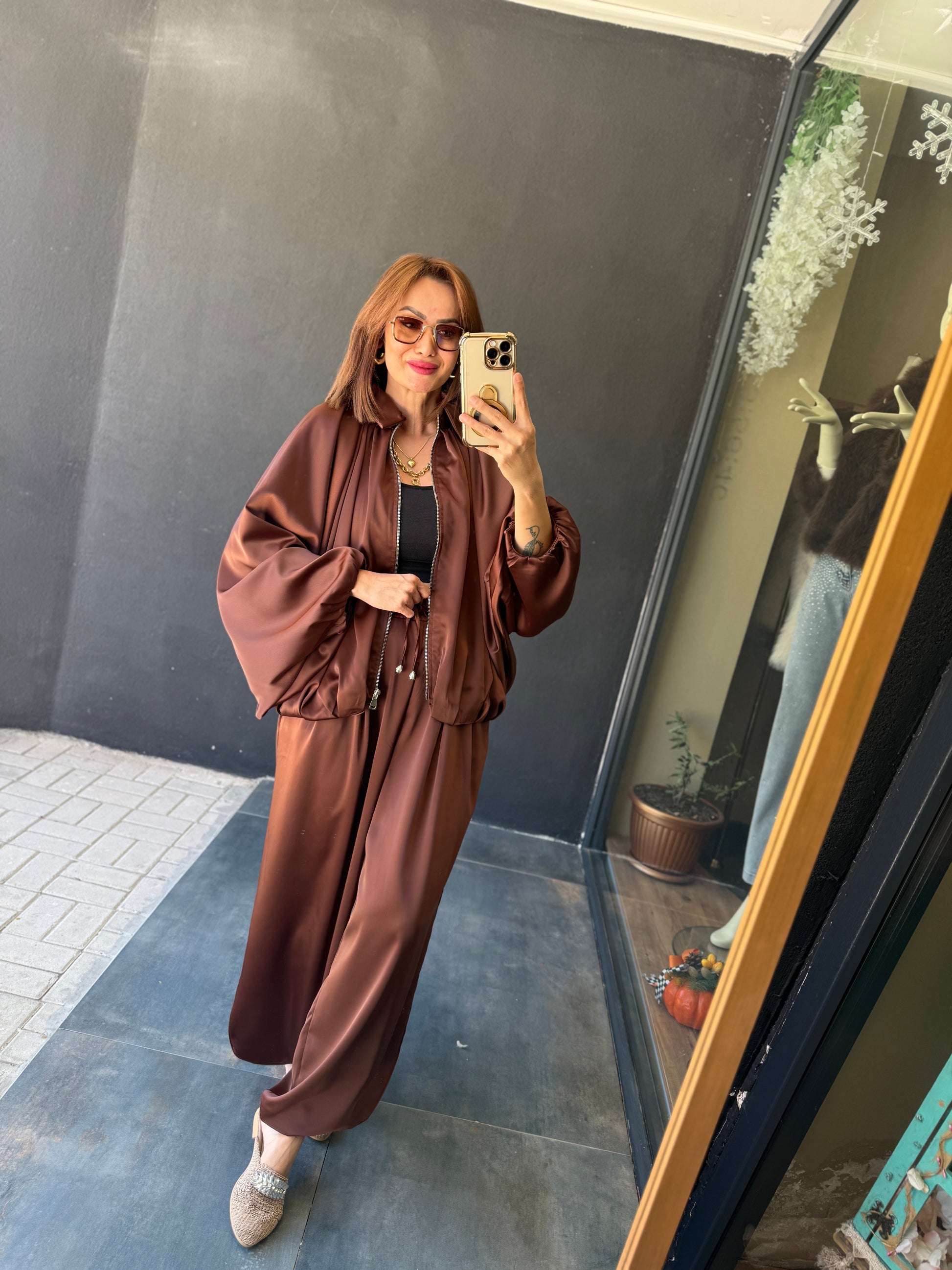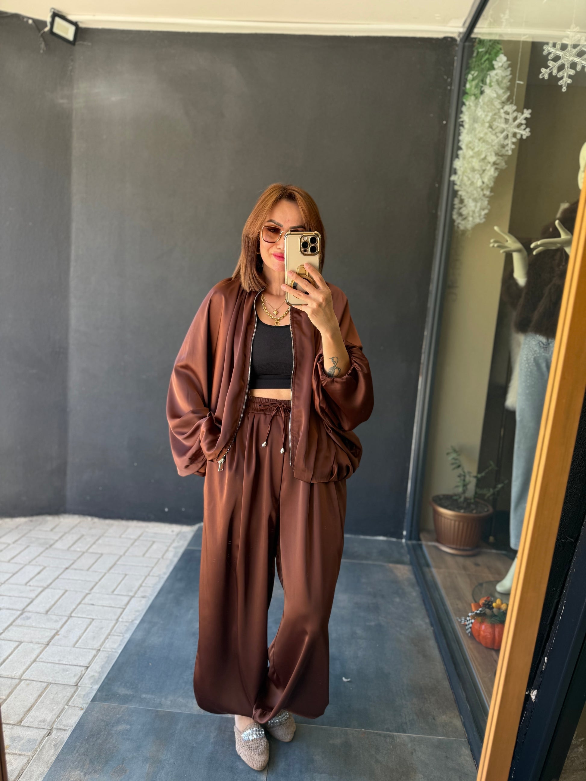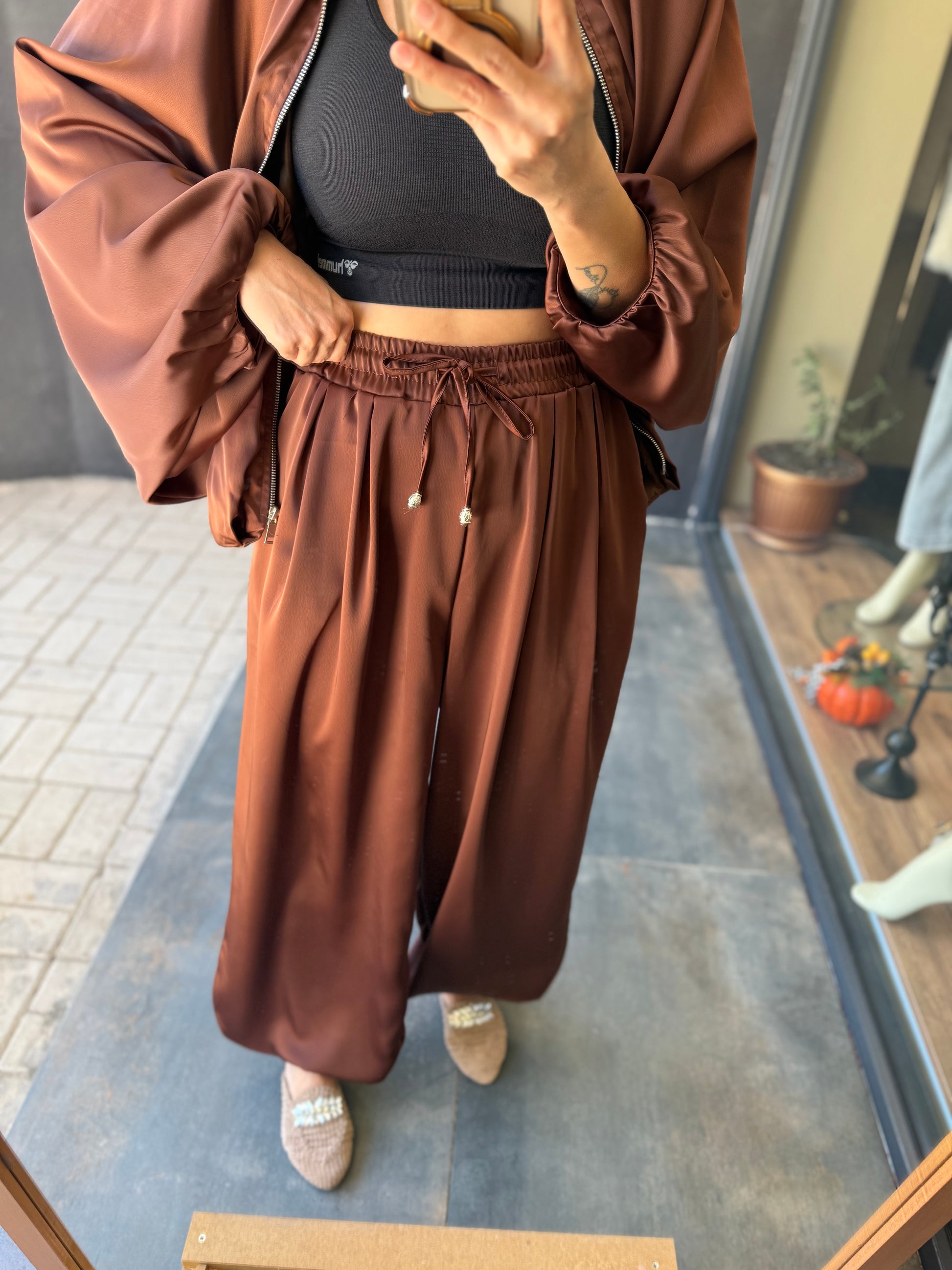 Cardinal Kahve Saten Bomber Takım
