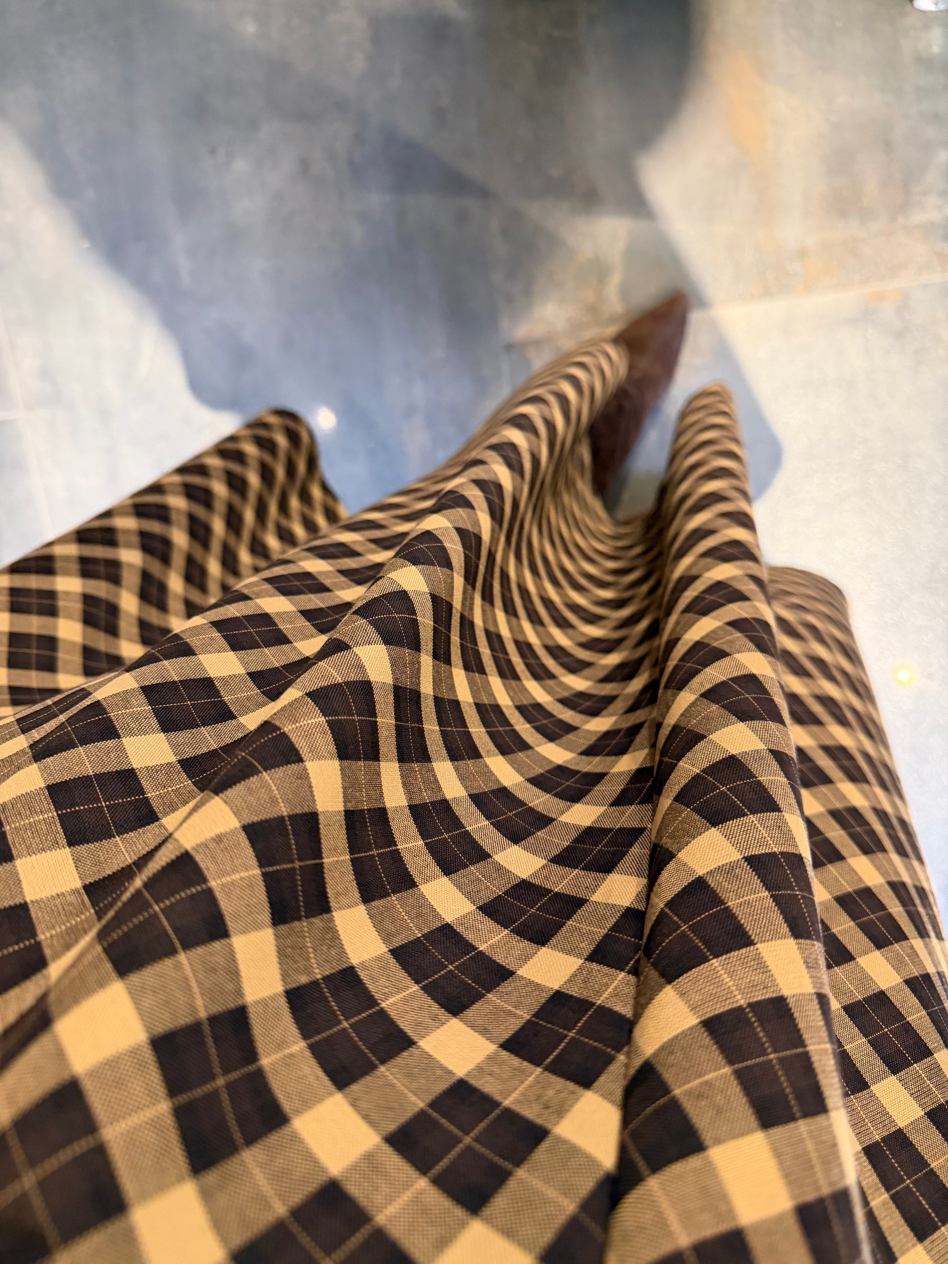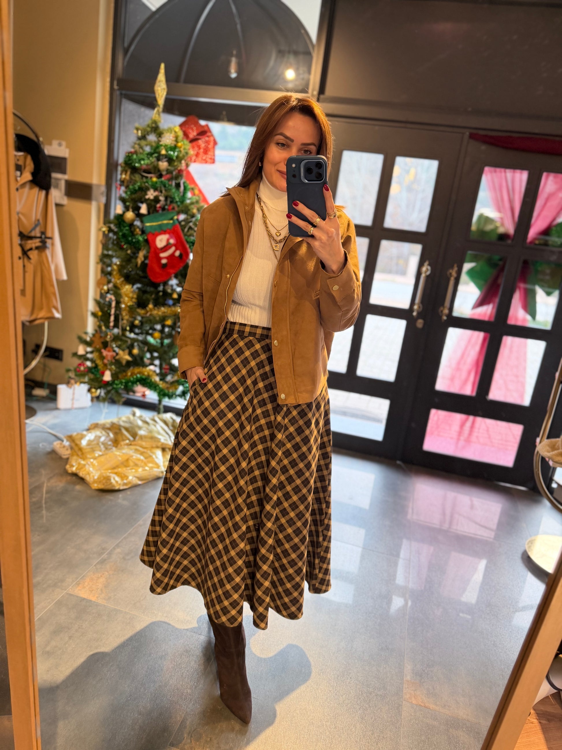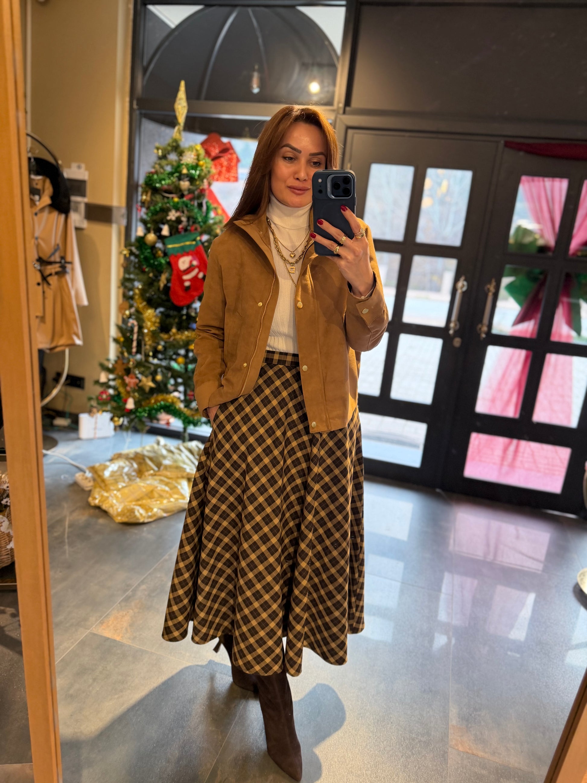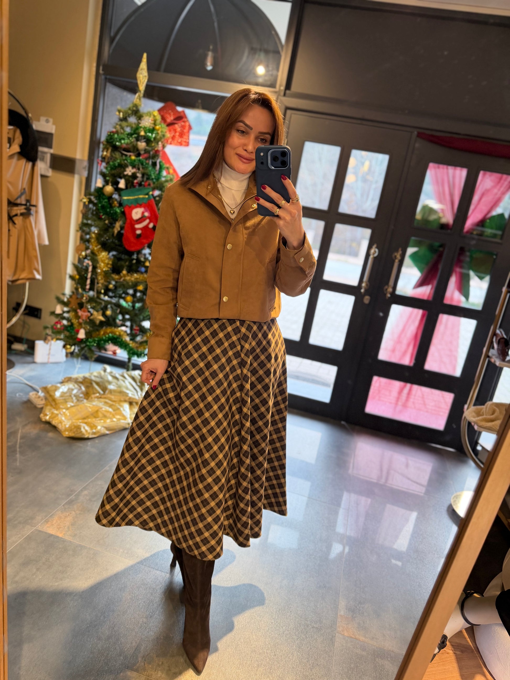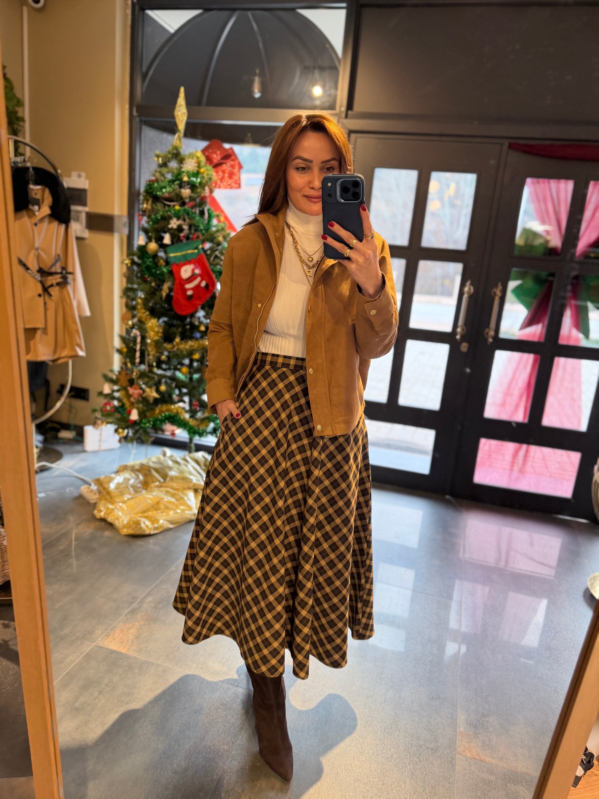 Cream 2 Kahve Midi Kareli Etek