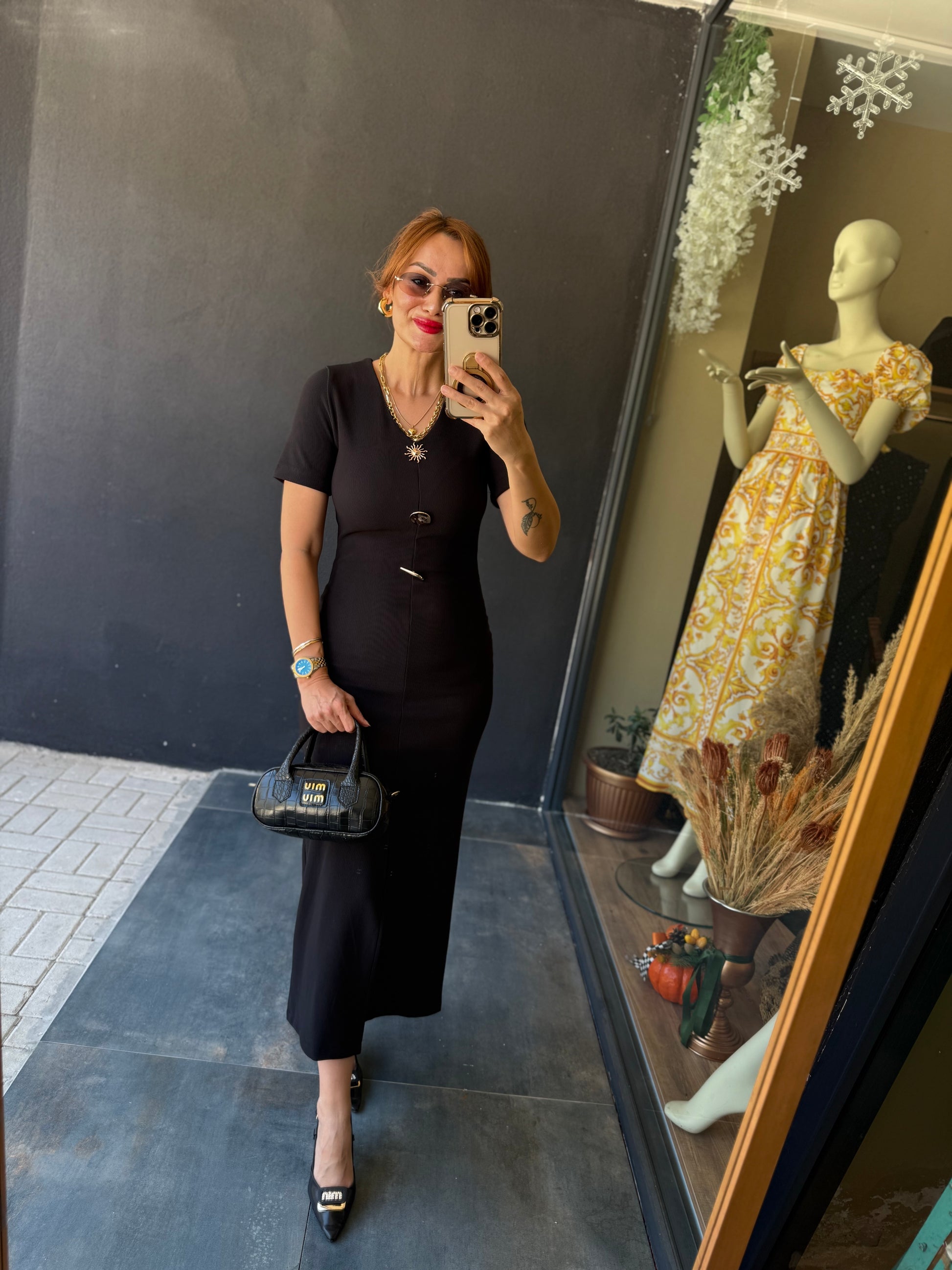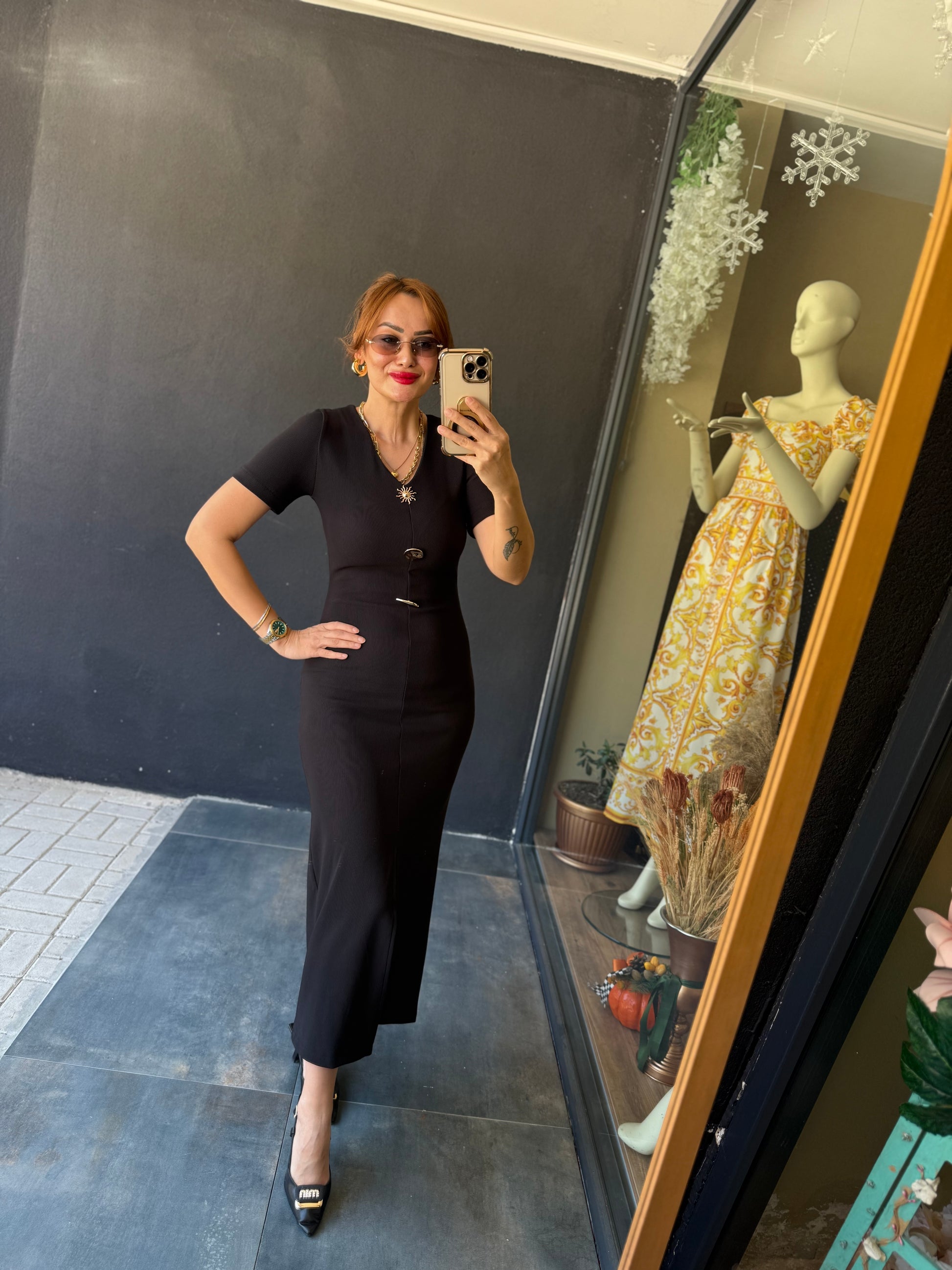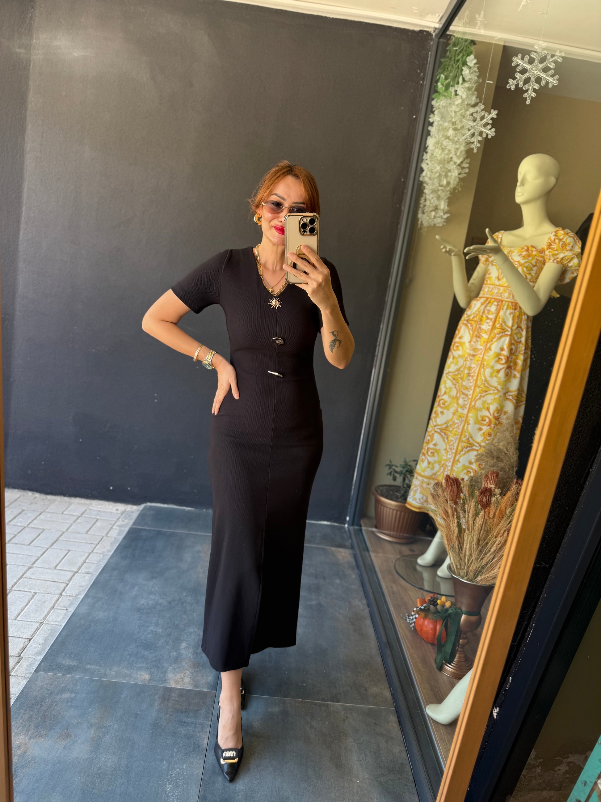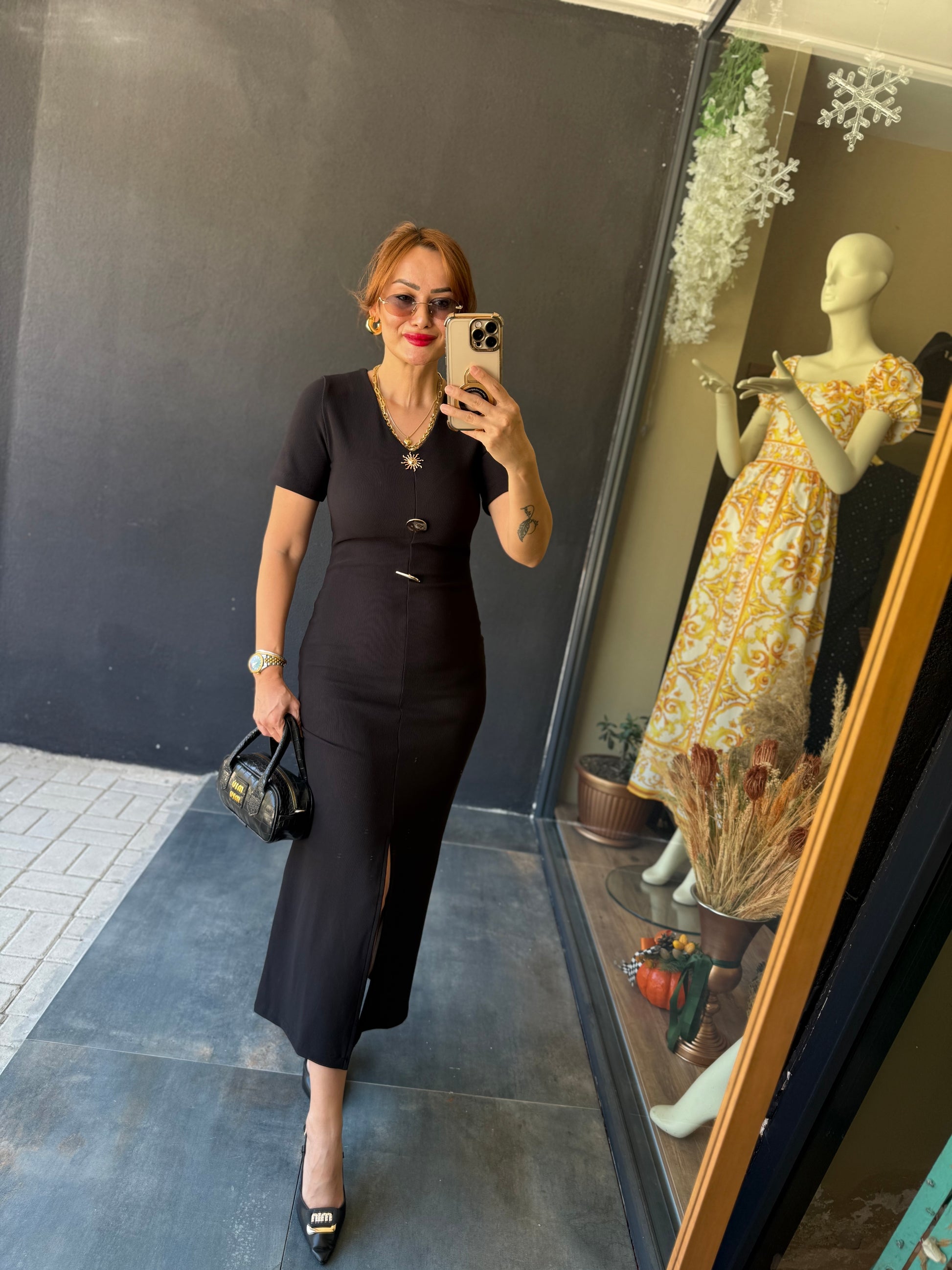 Henna Düğmeli Kısa Kol Siyah Kalem Elbise