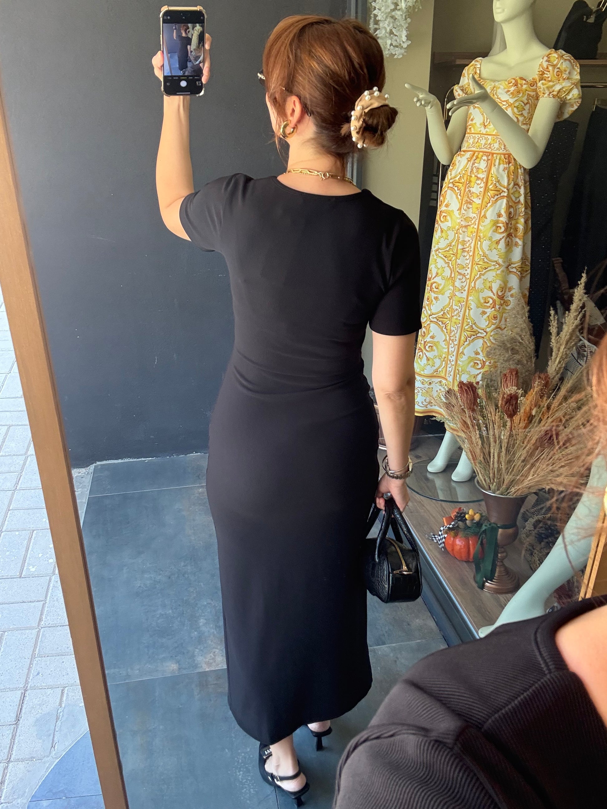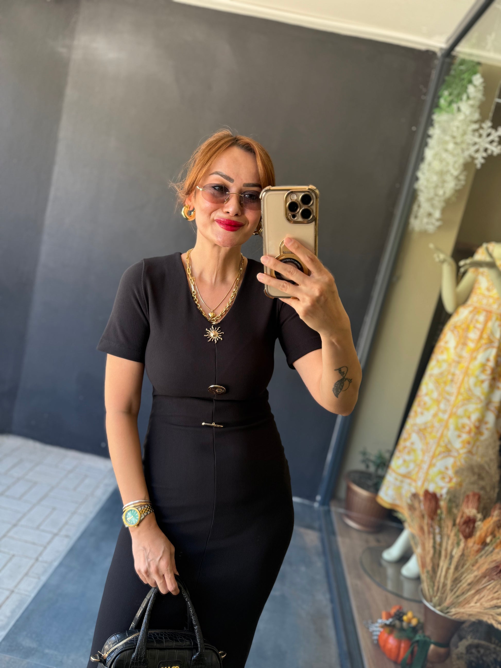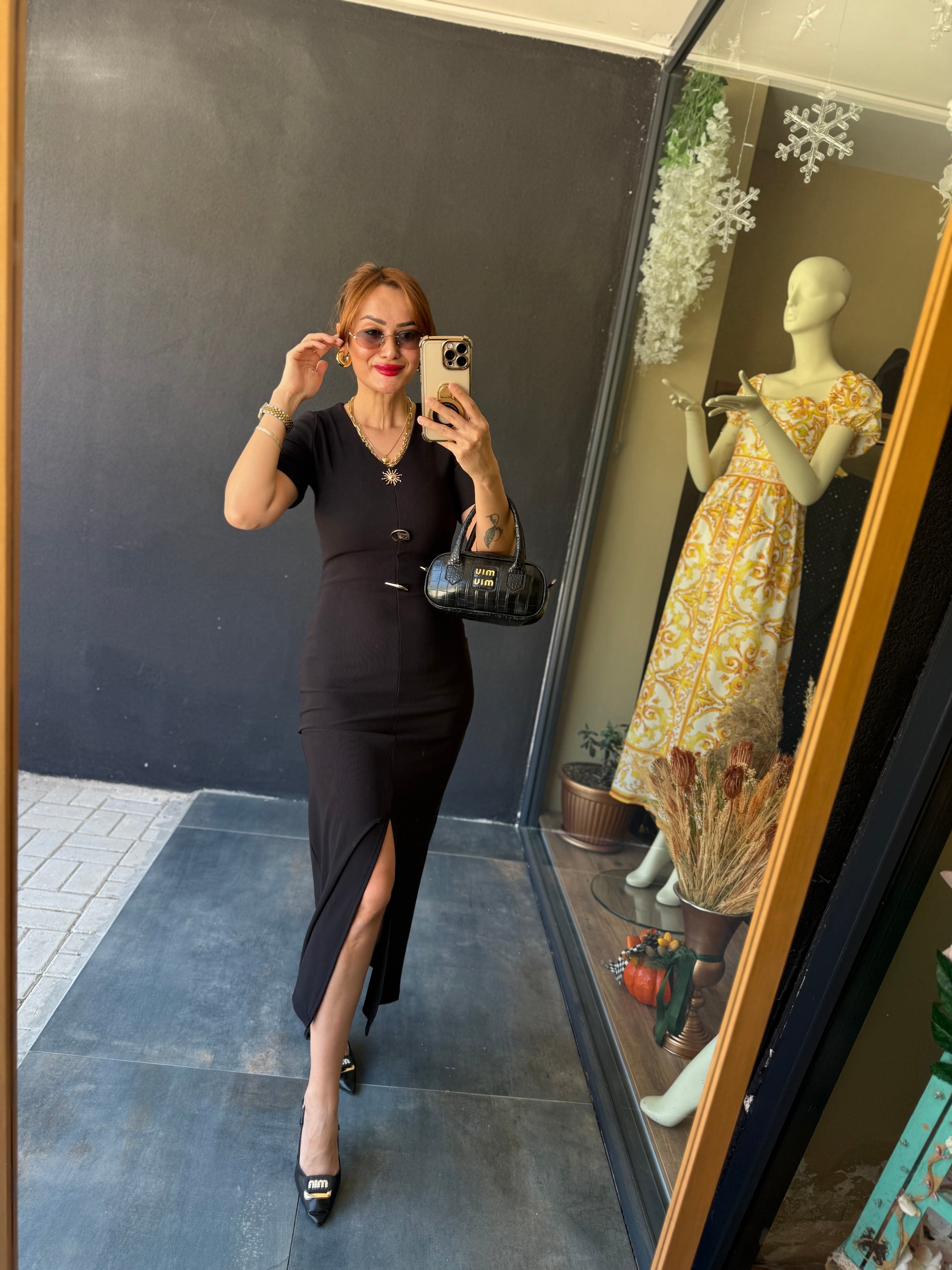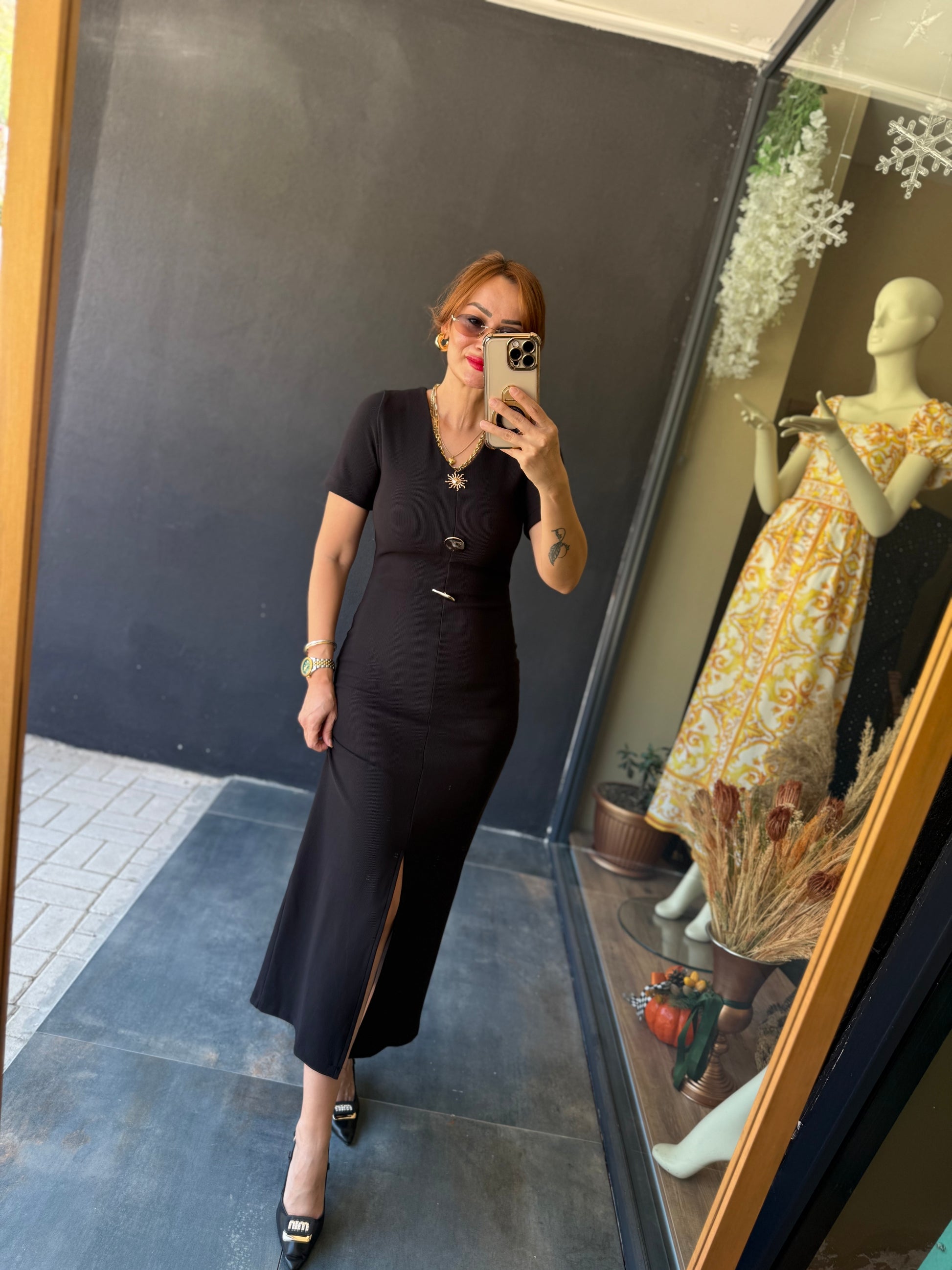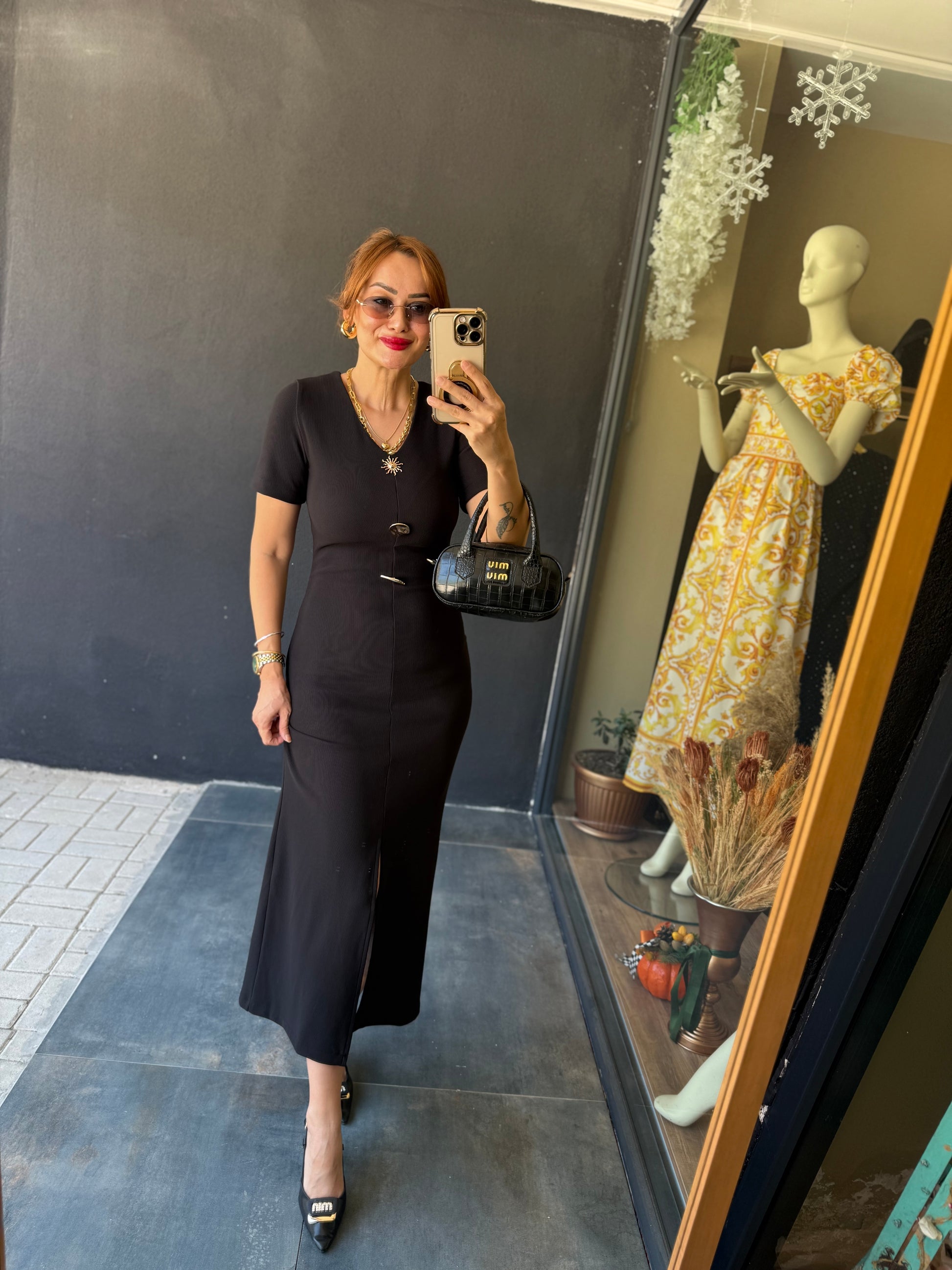 Henna Düğmeli Kısa Kol Siyah Kalem Elbise