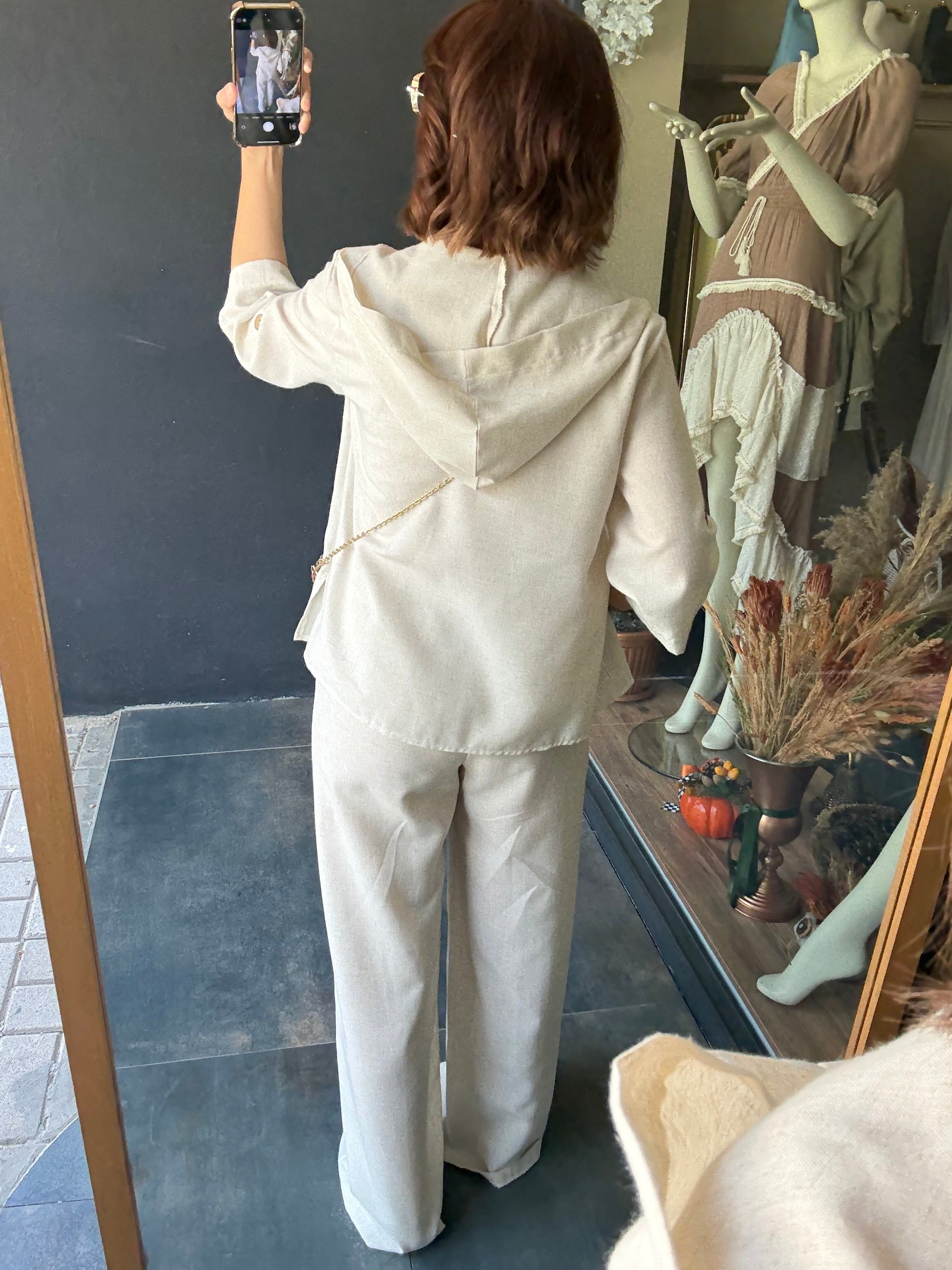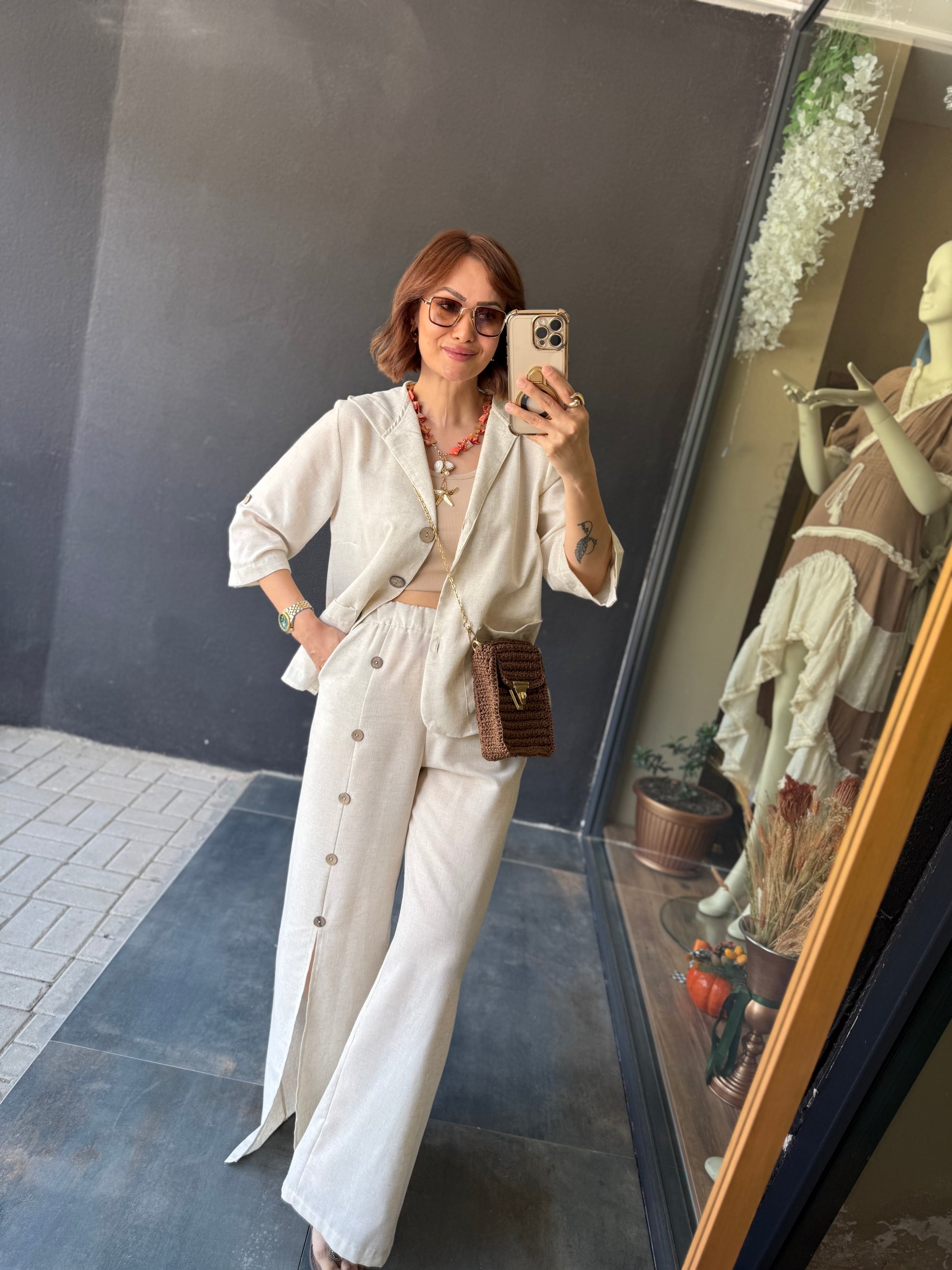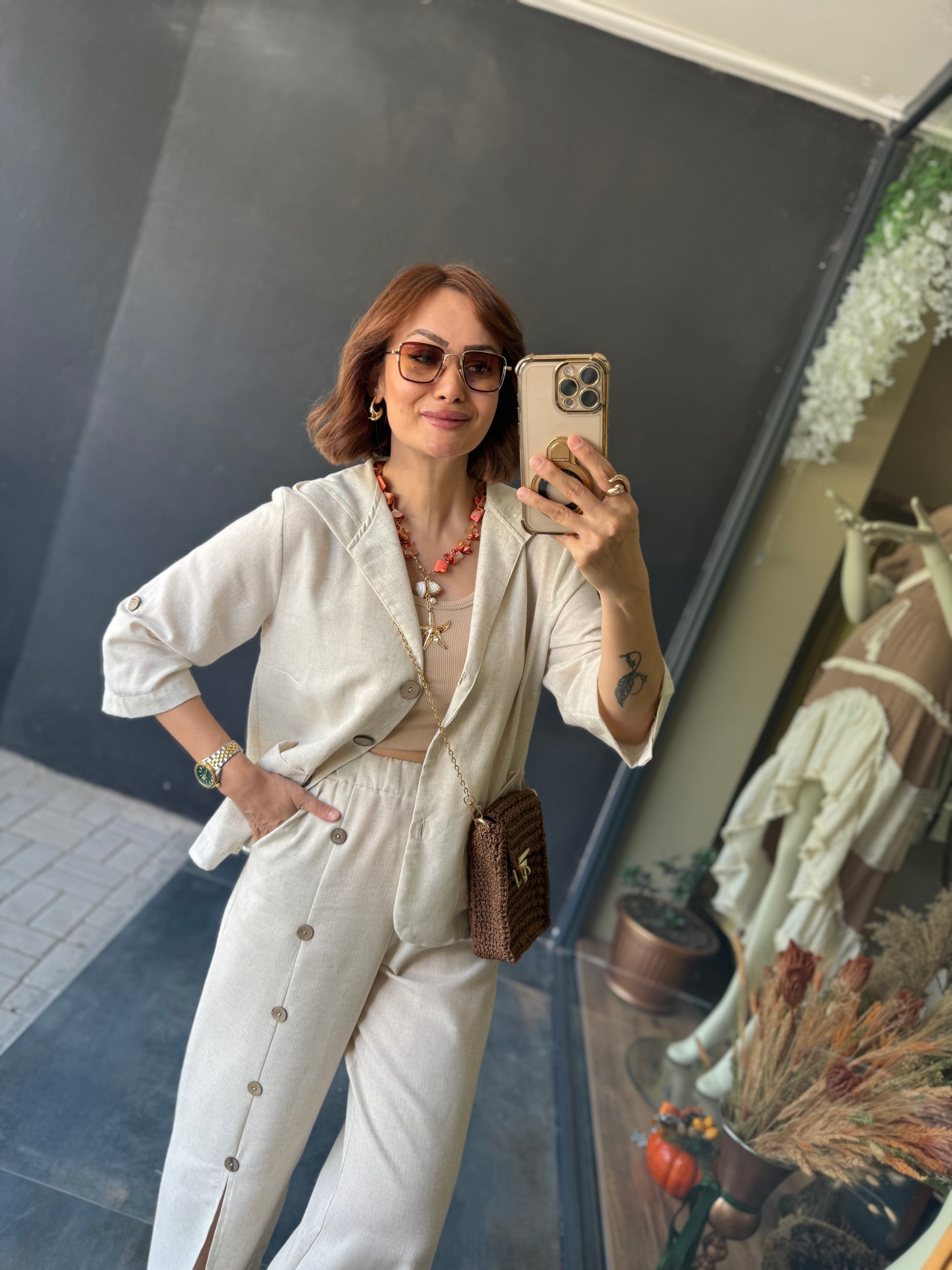 S M L XL Beden Düğme Detaylı Keten Takımımız Tam Kalıptır .