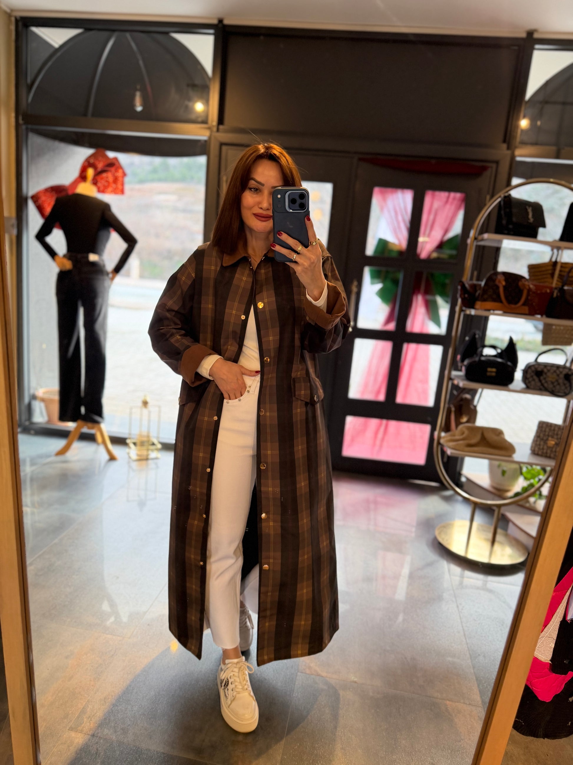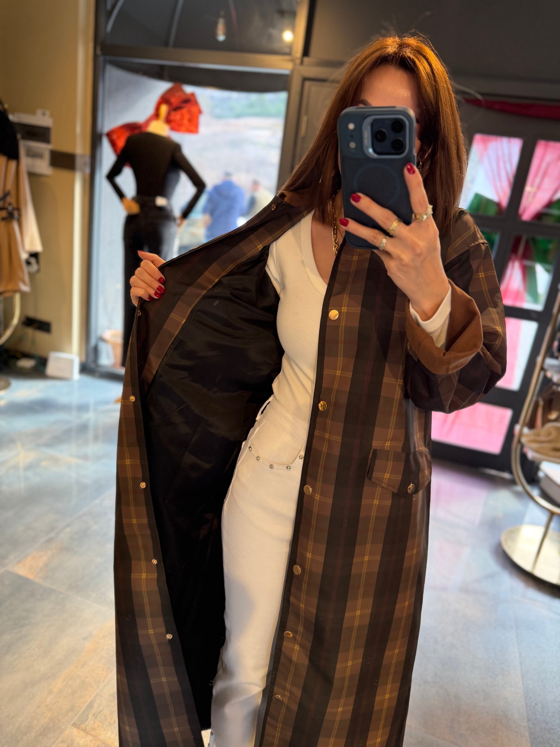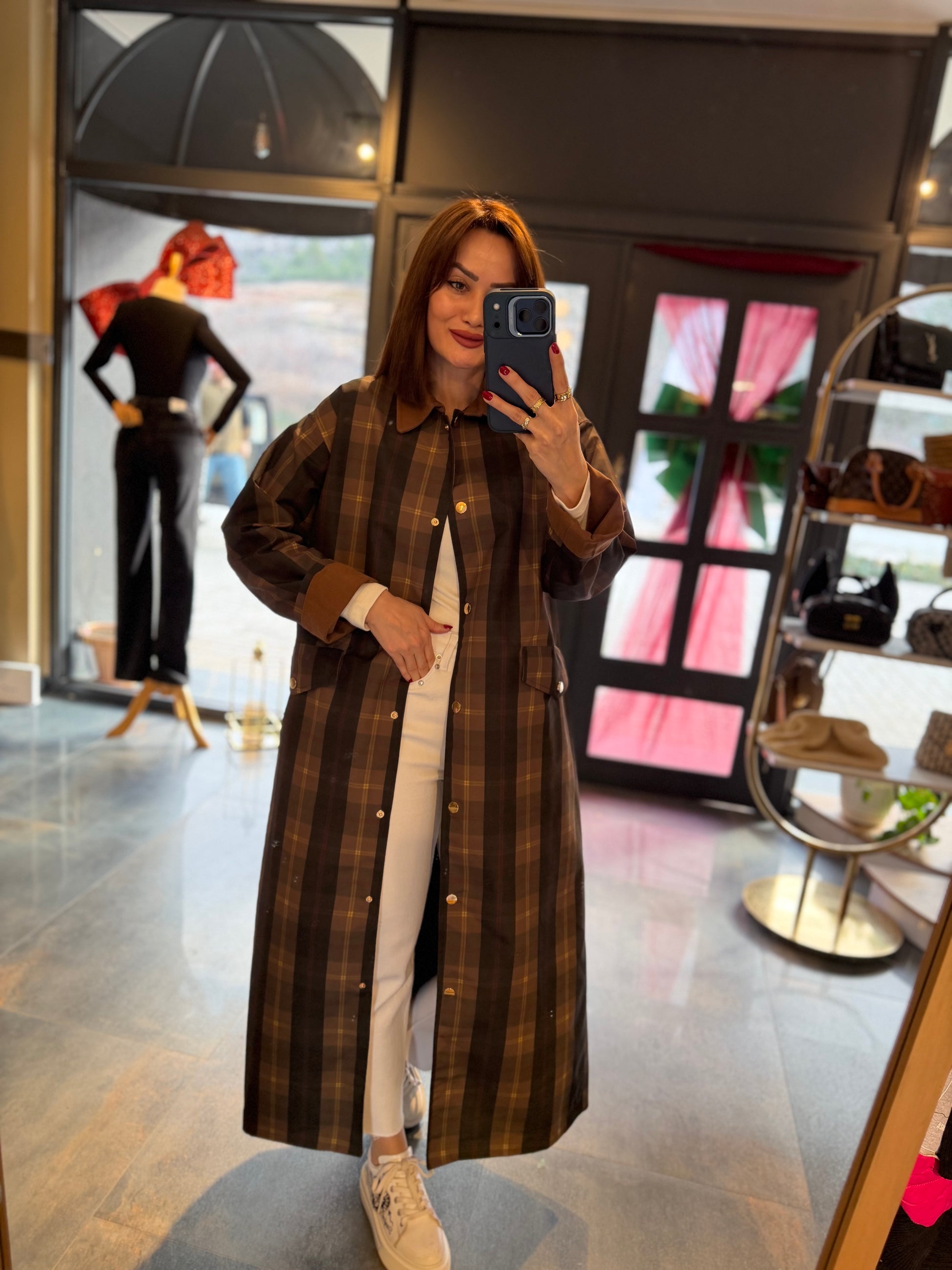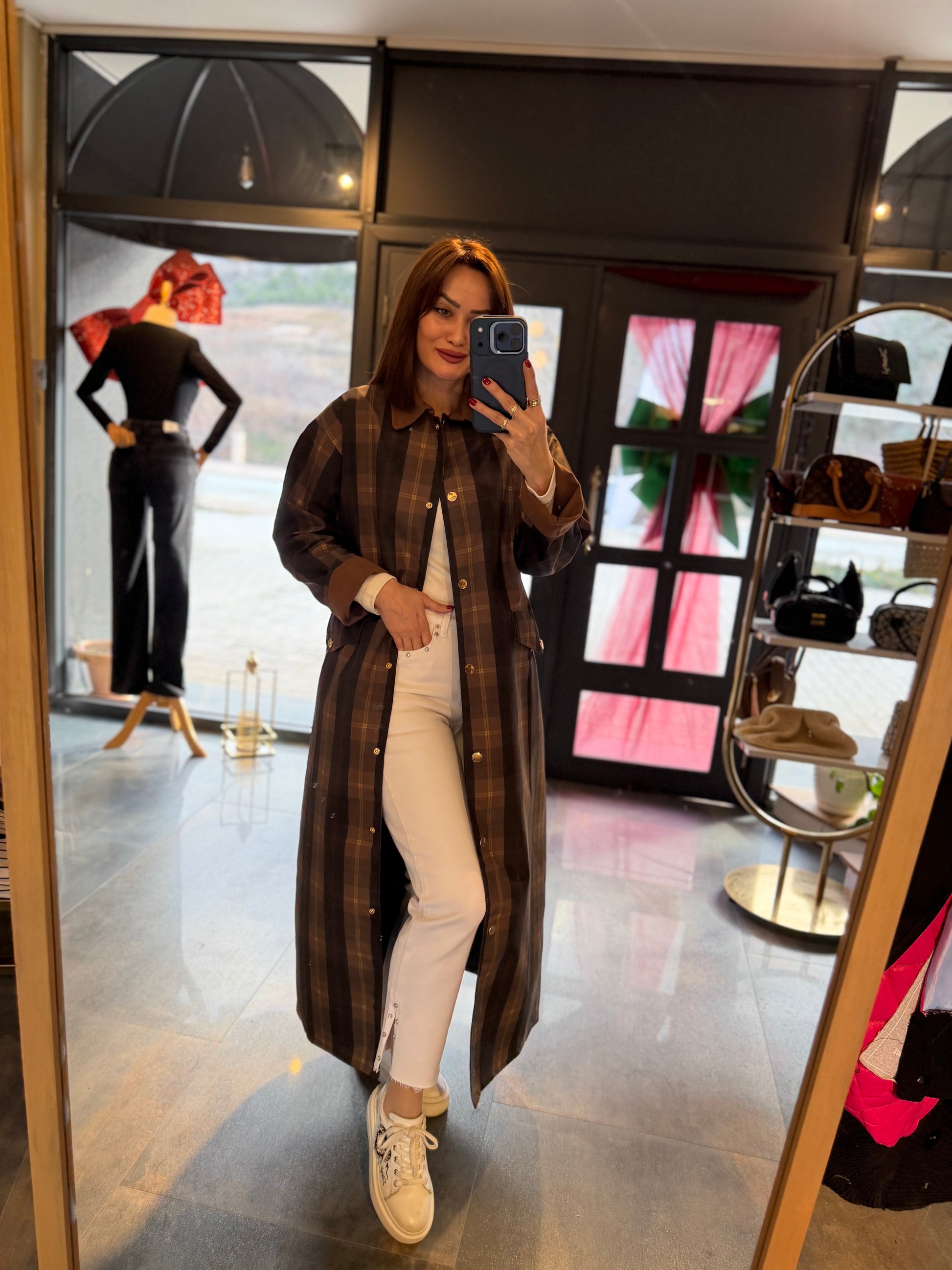 Mesli Kareli Su Geçirmez Trench