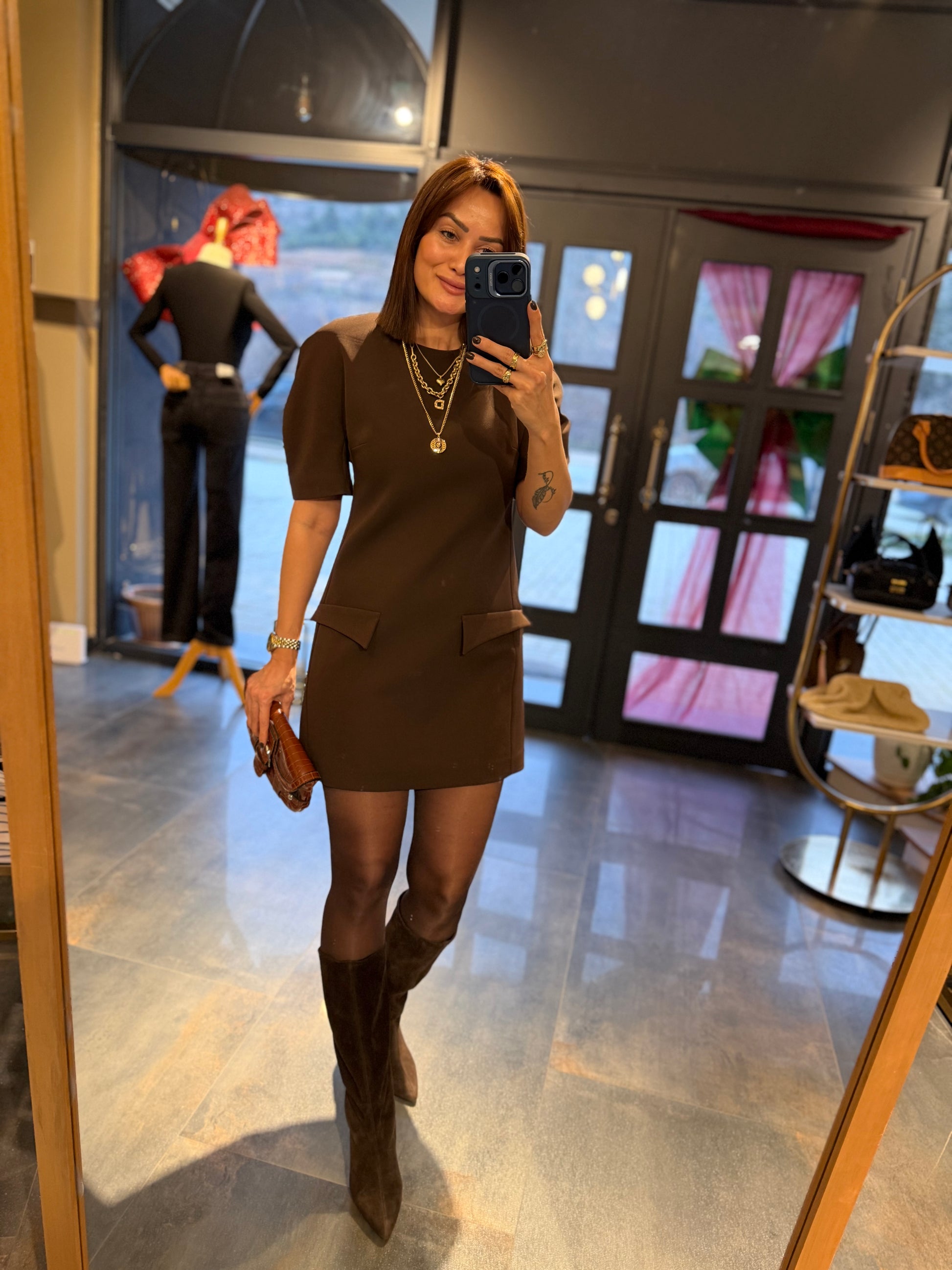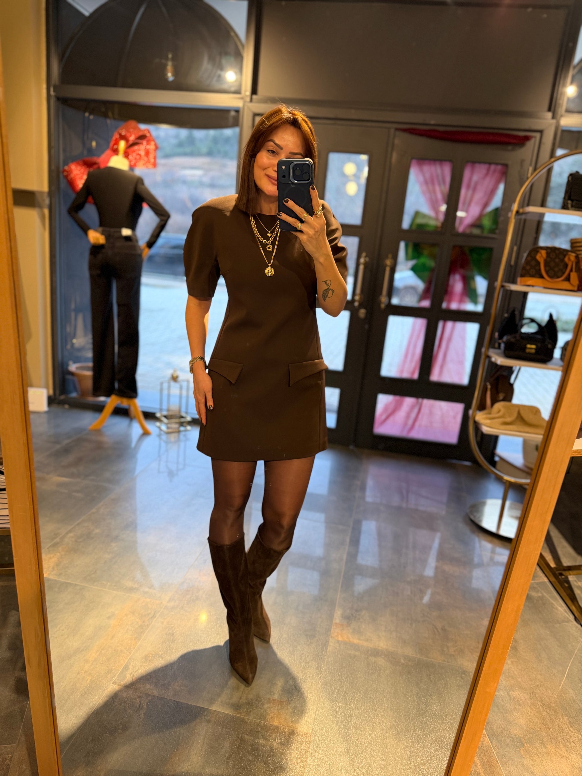 Moss Kahve Cep Detaylı Vatkalı Elbise
